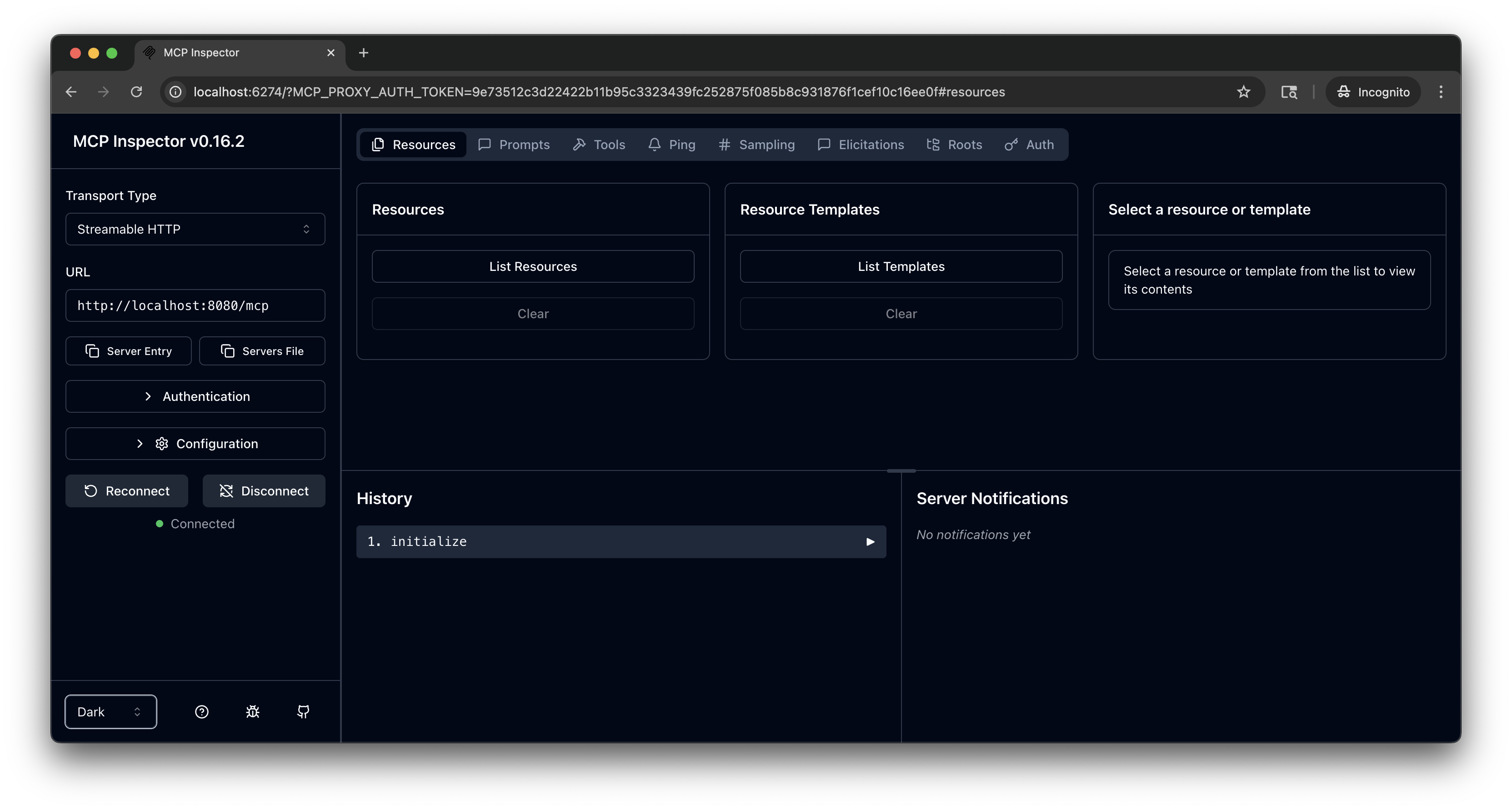 From the terminal, run the MCP Inspector command. Then, the MCP Inspector opens in your browser. If the MCP inspector tool does not open automatically, run